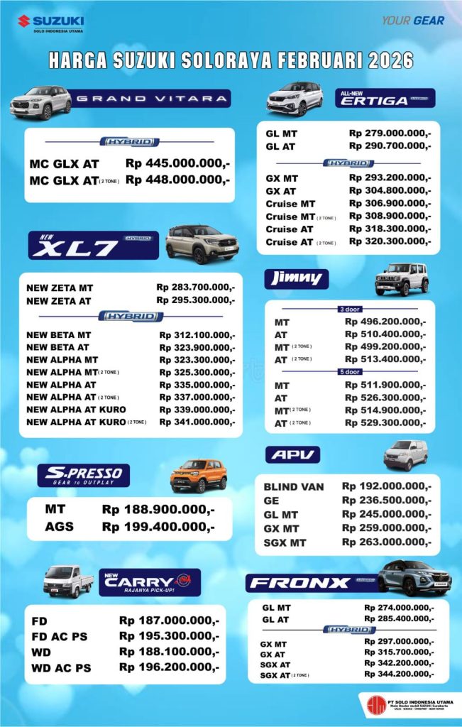 Suzuki Grand Vitara kembali hadir dengan peningkatan memukau dan karakter yang tajam. Dilengkapi mesin yang efisien dengan Smart Hybrid Vehicle by Suzuki (SHVS). Jelajahi setiap rintangan dengan beragam fitur terkini. Grand Vitara merupakan komitmen Suzuki dalam menghadirkan SUV yang handal. Informasi lebih lanjut silahkan kontak Sales Suzuki Soloraya kami berikan Promo Menarik ! Dan Pelayanan Terbaik…